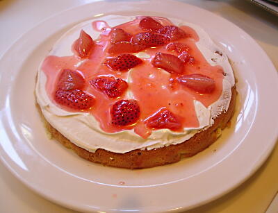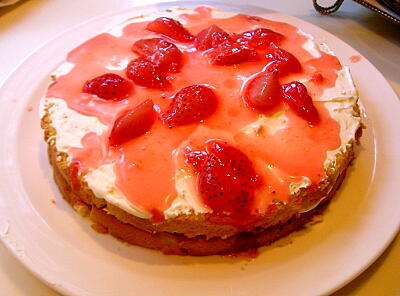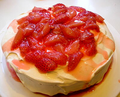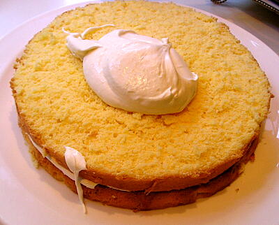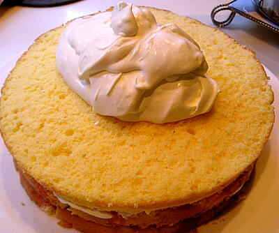 【5】スポンジ1枚目に生クリーム1/3をかけ苺ソー1/3をかけ繰り返す
