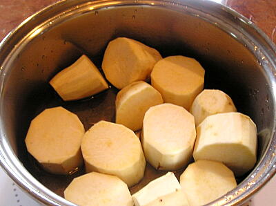 【1】サツマイモを適当に切って万能カップ1で、湯がく。