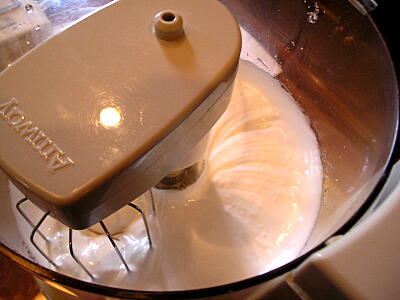 【2】卵を卵白と卵黄に分け、卵白で2/3の砂糖を加え、メレンゲを作る。
