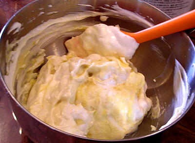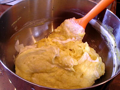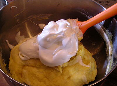 【3】さつまいもが柔らかくなったらつぶして熱いうちにバターを混ぜ込み、砂糖1/3を加えあら熱がとれ冷めたら牛乳と、卵の黄身を混ぜる。さらに【2】のメレンゲを3回ぐらい分けて軽く混ぜ込む