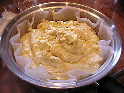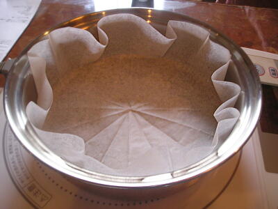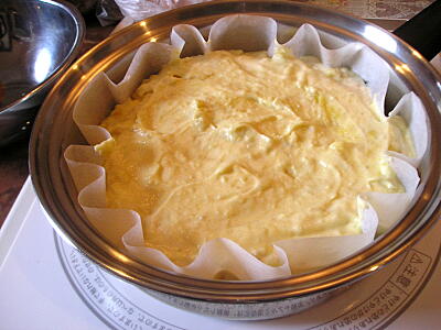 【4】中フライパンにクッキングシートを敷き、側面にバターを塗り、その中にタネを流し込みケーキモードで焼く。