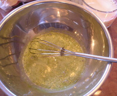 【2】ミキシングボウルに豆乳を少量とり、カテキングリーンを加え、よく混ぜて溶かす。ここに残りの豆乳を少しずつ加え、最後ににがりを入れて混ぜ合わせる。