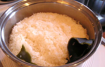 【4】 シチューパンに水(筍とわかめのお吸い物用)を入れて仕切板をセットし、ドーム型カバーをしてインダクションレンジIII「マニュアル7」で加熱する。沸騰したら「マニュアル2」に下げ、3を仕切板にセットし、ドーム型カバーをして約2〜3分間蒸す。ときどきフタを開けて蒸し具合を確認する。