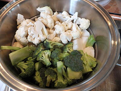 【1】ラディッシュと黄色パプリカ以外の1の野菜を6Lスティーマーに入れ、IR「マニュアル3」(弱火)にし、約15分蒸す。