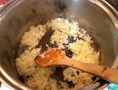 【1】4LシチューパンにIRマニュアル7で予熱し、バターを溶かし、たまねぎ、にんにくを加え炒める。ドーム型カバーをしてIRマニュアル3で2分加熱する。