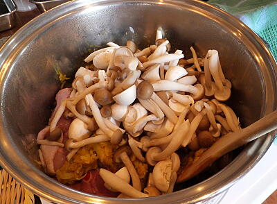 【3】鶏肉、きのこ、白ワインを加え混ぜ、さらにAを加えてよく混ぜ、IRマニュアル7でドーム型カバーをかぶせる。