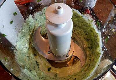 【2】「手作りマヨネーズ」は、油以外の材料をフードプロセッサーに入れ、フタ部分の注ぎ口から油を入れて、乳化するまでかくはんする。1/3ずつに分けて「白ごまマヨネーズ」「バジルソース」の材料を加え、かくはんする。