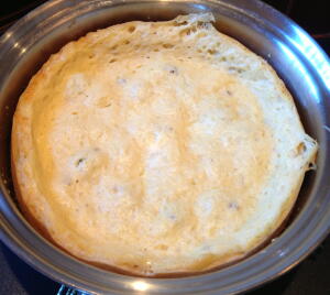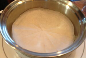 【2】【1】の生地をのばし、中フライパンに8分目の高さまで、きれいに敷きつめる。