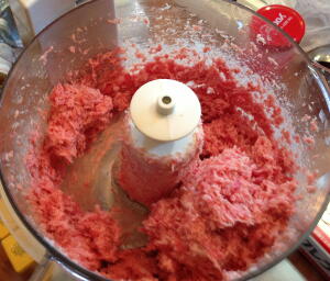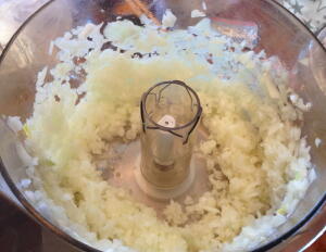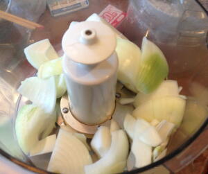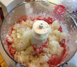 【1】FP(メタルブレード)でみじん切りにしメタルブレードをドゥブレードに交換しタマネギと合い挽き肉をよく混ぜ合わせ、塩こしょうで味付けする。