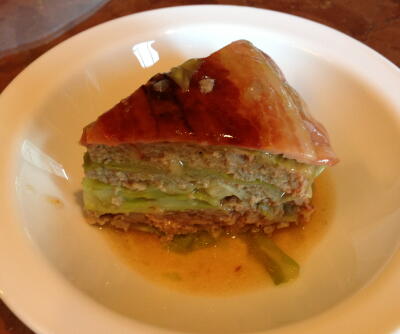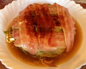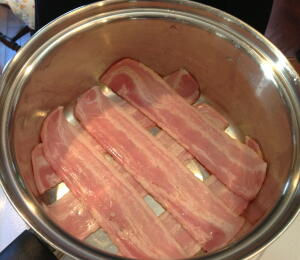 【2】大ソースパンの底にベーコンを交差させ並べて敷く。その上に適当な大きさに切ったキャベツを敷き詰め【1】の1/3を全体にのせ、これを3回繰り返す。最後に大きめのキャベツを包み込むように敷く。