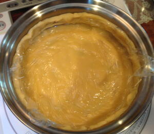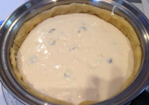 【4】【3】のフィリングを2の中フライパンに流し入れ、表面をならし、タルトモードで焼く。