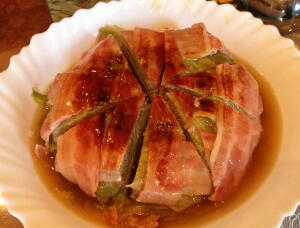 【4】竹串を刺し透き通った汁が出てきたらスープを他の容器にとり、ロールキャベツを皿に盛る。