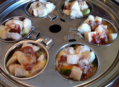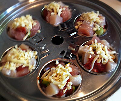 【3】2つのココットに、ホタテ貝柱、ウズラの卵を割り入れてもう2つにはささみと、トマトソース、ピザ用チーズ、パセリをのせてスチーマーに並べる