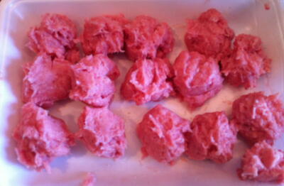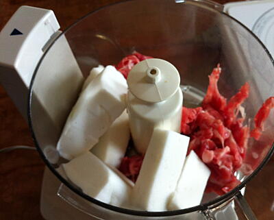 【1】FP(メタル)で豚こまとはんぺんをなめらかにする。さらに丸めて肉団子にしておく。