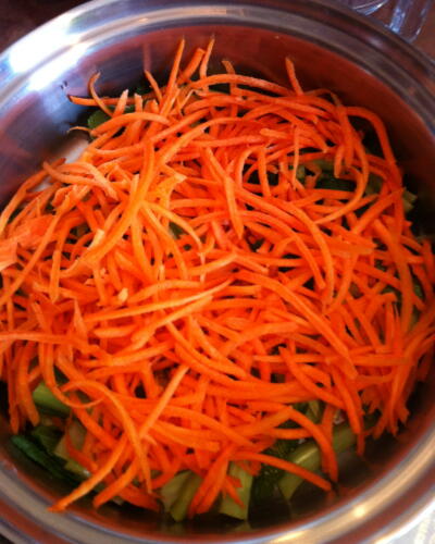 【1】 人参はFP(シュレッダー)で千切り)にしておく。
