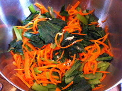 【2】人参とほうれん草を少量の水でゆでる。