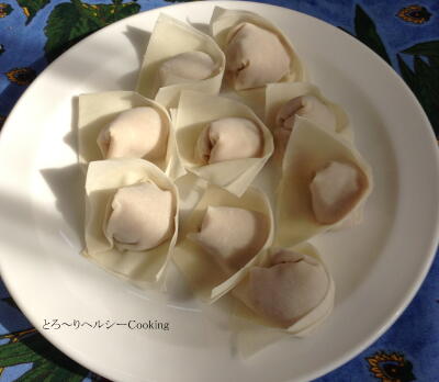 【3】ワンタンの皮に豚ミンチあんを包み、沸騰した湯に入れて