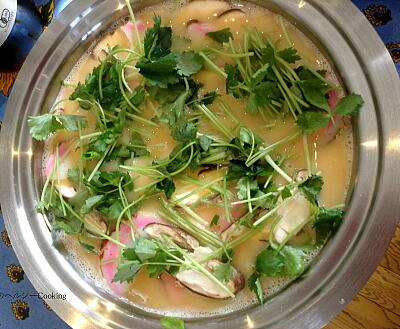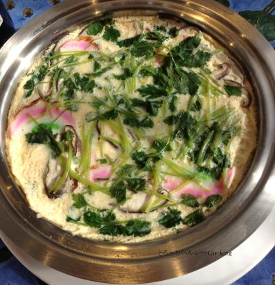 三つ葉を散らしワンタンスープの上に置き15分蒸す。そのまま食卓へ