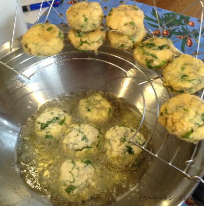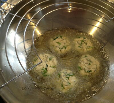 【2】中フライパンに油を入れ180℃にし【1】をスプーンですくってフライパンに落とし
