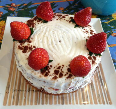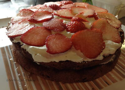 【5】下段のスポンジにシロップを塗りクリームを塗り、イチゴをおいてさらにスポンジをおいて同じく繰り返す。