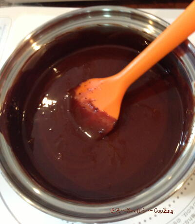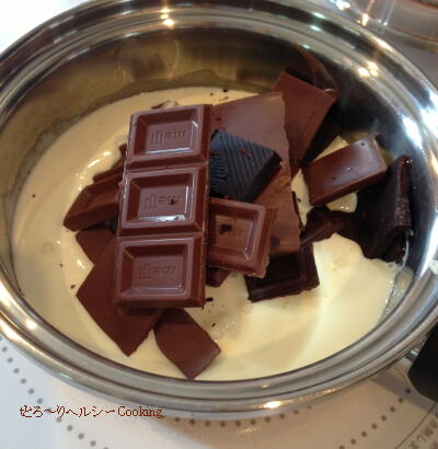 【2】鍋に生クリームを入れ沸騰前に火を止める。細かく切ったチョコレートを、入れて溶かす。
