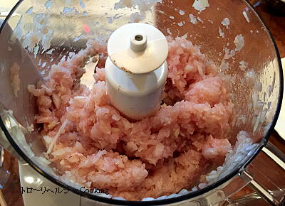 【1】玉ねぎををフードプロセッサーで軽く混ぜる。鶏肉を入れ混ぜる