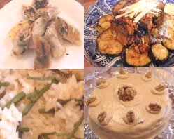 | 2014年8月 夏祭りのバラ寿司・カボチャのマヨネーズ焼き・三つ葉と豆腐のお吸い物・イチジクのタルト ![]() |