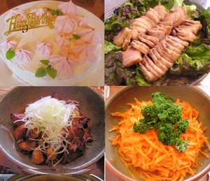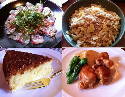 | 2012年4月 和風鶏の唐揚げ・タケノコご飯・三つ葉のお吸い物・カルパッチョ・ごまケーキ ![]() |