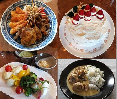 ![]() 04,04月 鯖の竜田揚げ・・チキンステーキ・・たけのこご飯・・てんぷら・・苺のショートケーキ |