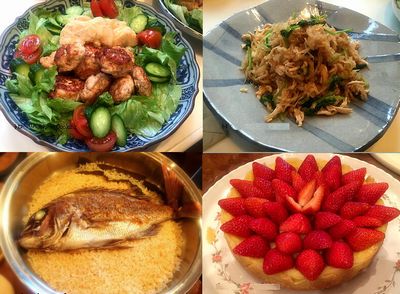 | 2014年4月 鶏ハム・昆布茶スパゲッティー・筍のフライ・苺タルト ![]() |