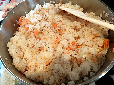 【1】水と合わせ酢をよく混ぜ、米と鮭を入れ炊く。