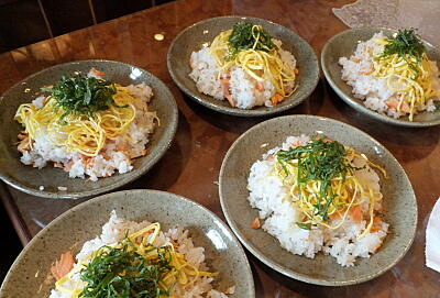 【3】鮭の身をほぐし骨を取って、ごまとか青ジソとか好みで混ぜ合わせ、錦糸卵やのりなどかける。