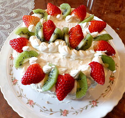 【4】3枚に、スライスしたスポンジの、底の部分をひっくり返し、皿に置き、クリームを塗り、苺を並べ、スポンジを置き、 同じように繰り返す。 |